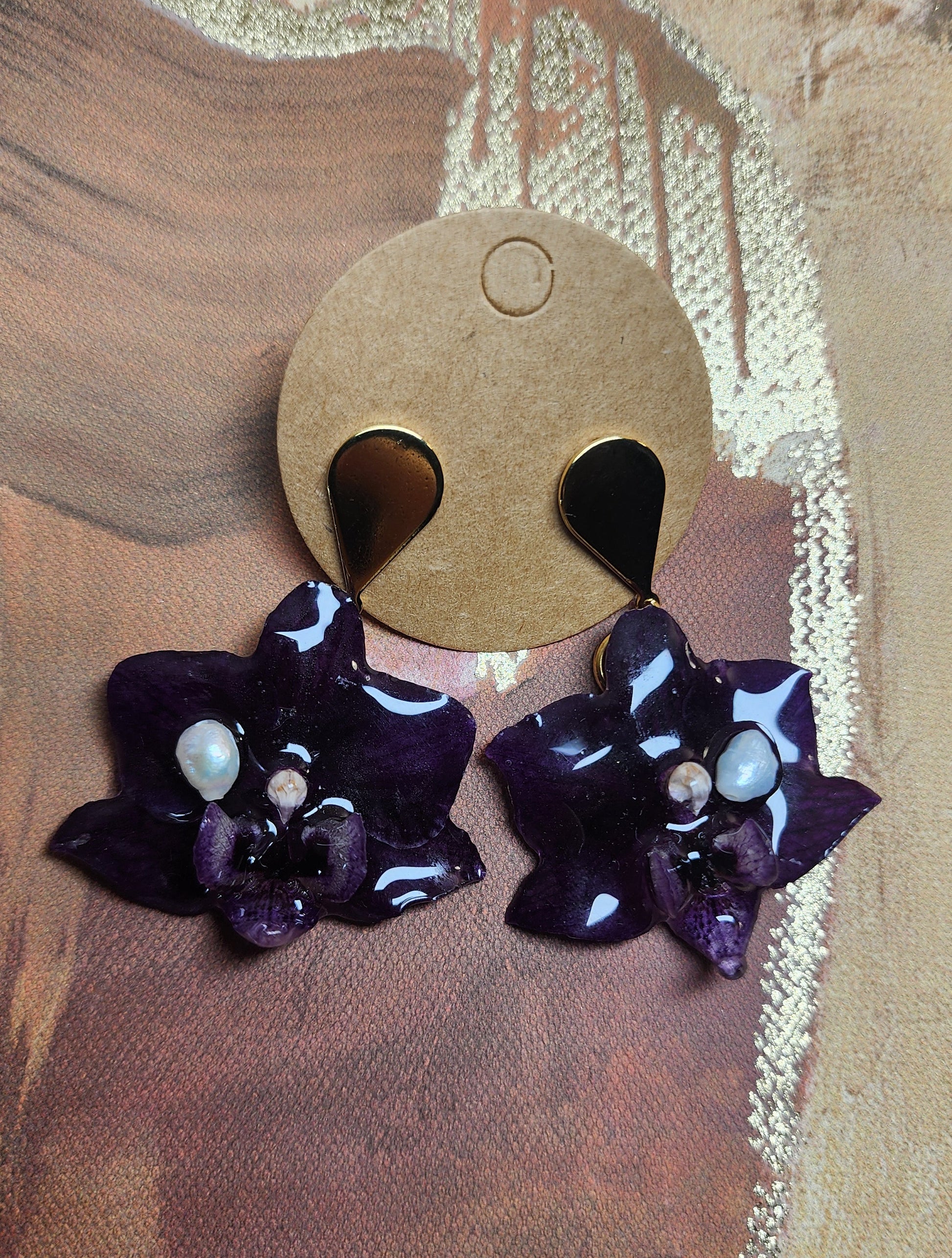Aretes de mini orquidea encapsulada con aplicaciones de perla de agua dulce, montado en una base de acero inoxidable chapado en oro de 24 kilate.