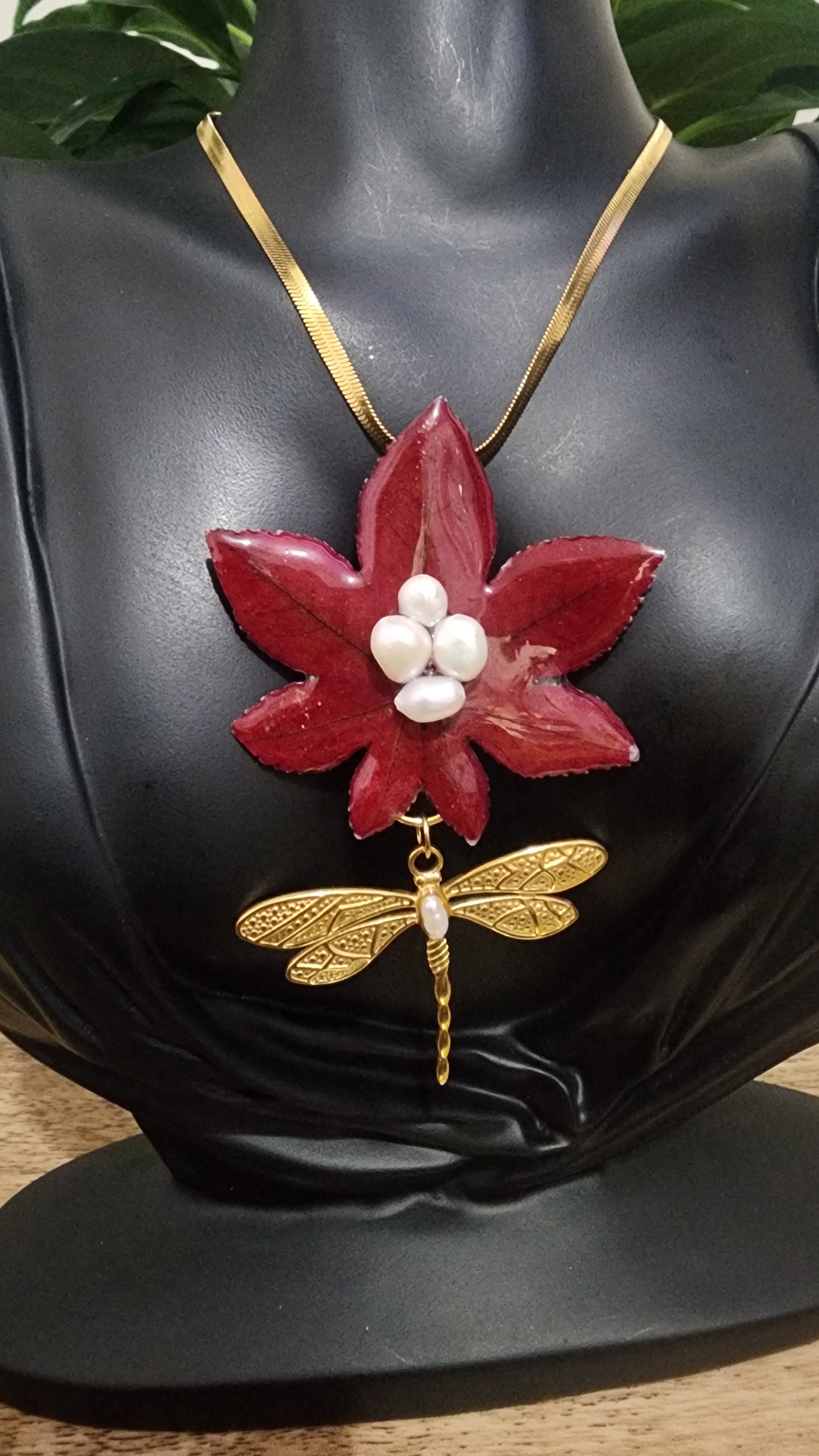 Hoja natural encapsulada en resina, con aplicaciones de perla de agua dulce y colgante de libélula.