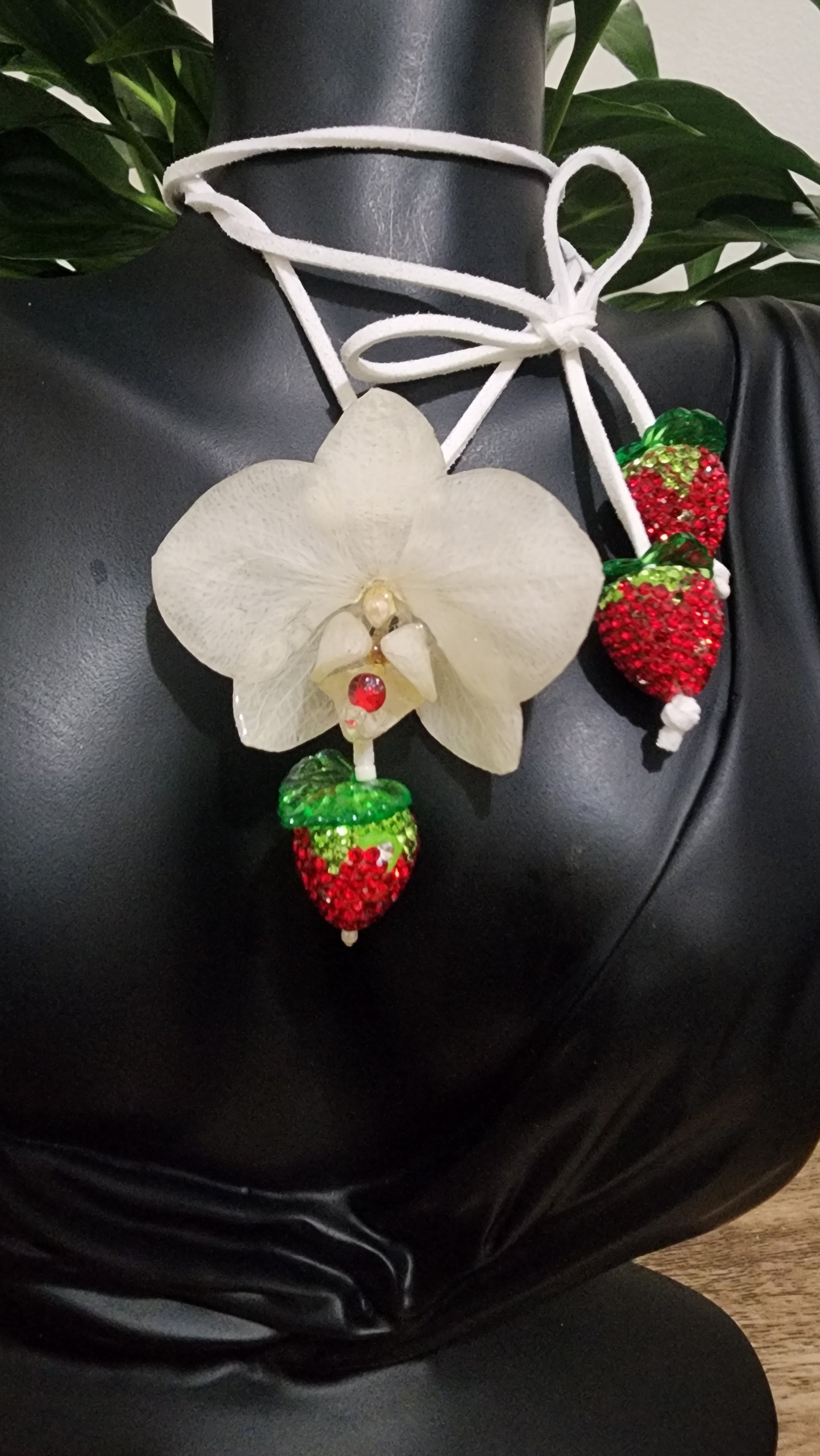 Orquidea natural encapsulada en resina y piedras en forma de fresa con cristales.