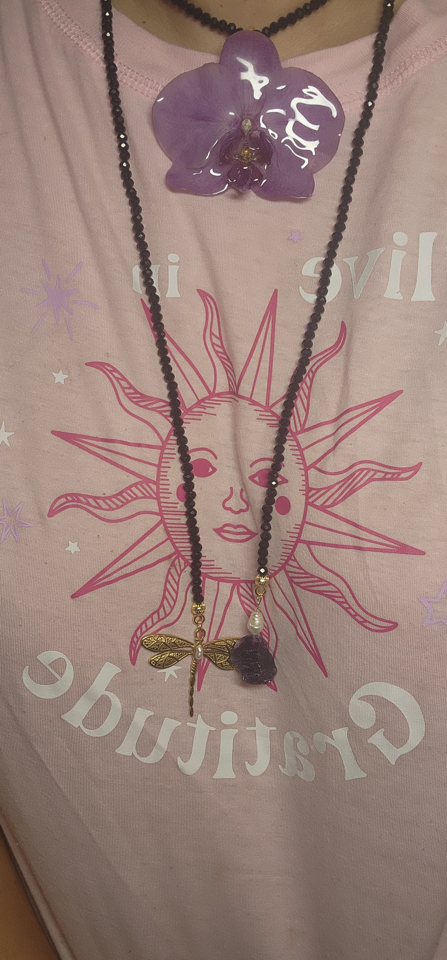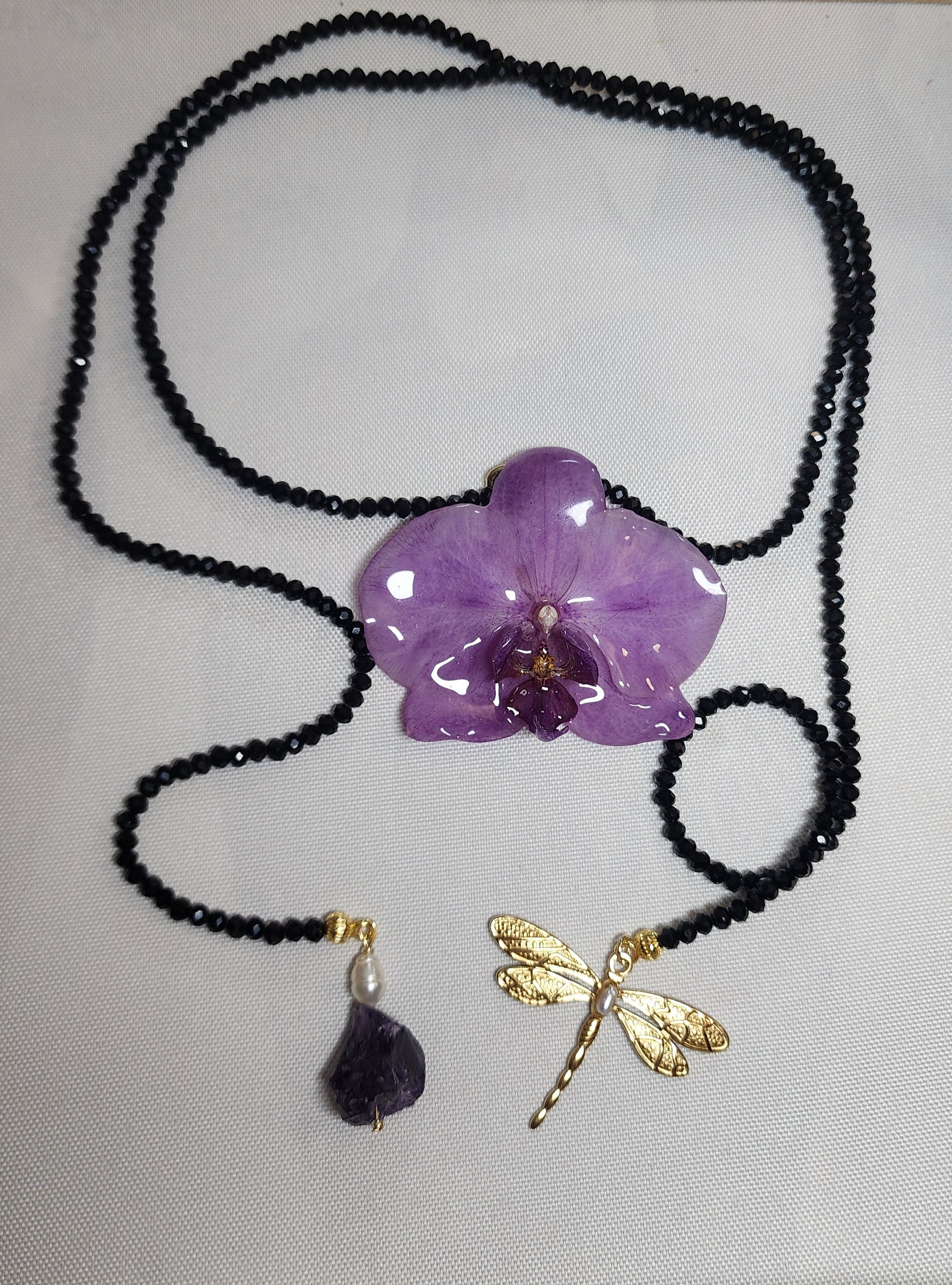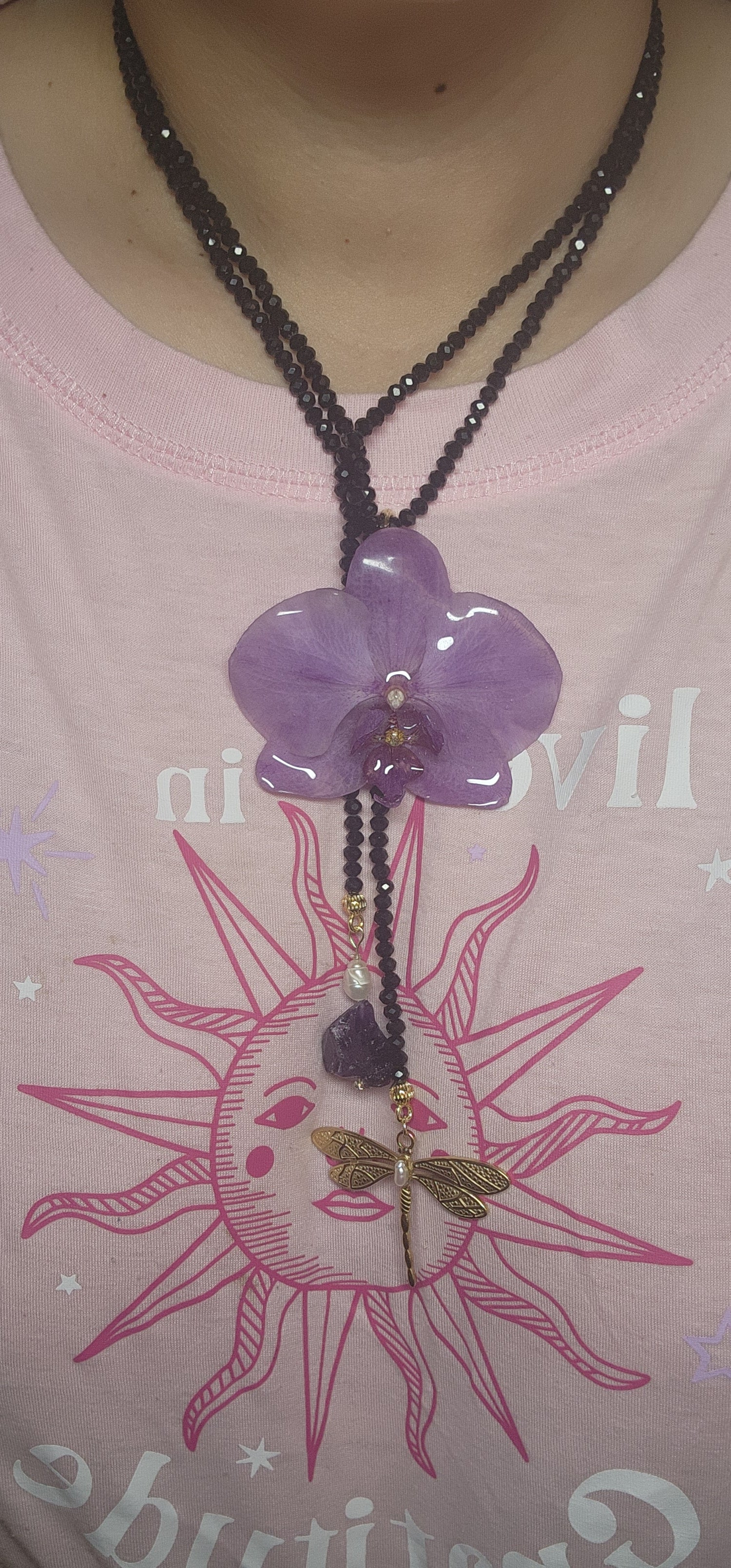 Orquidea natural encapsulada con dije de libélula y piedra de amatista y Collar de cristales negro.