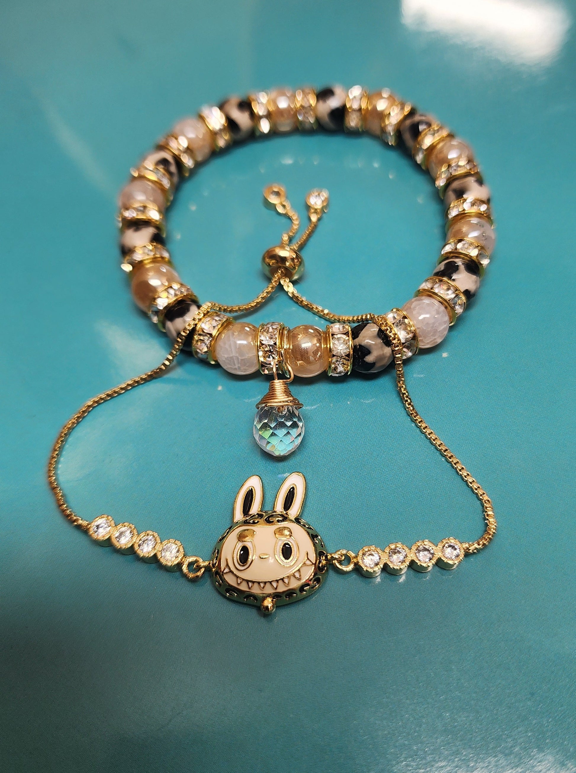 1) Pulsera y dije labubu de acero inoxidable chapado en oro 18 quilates.