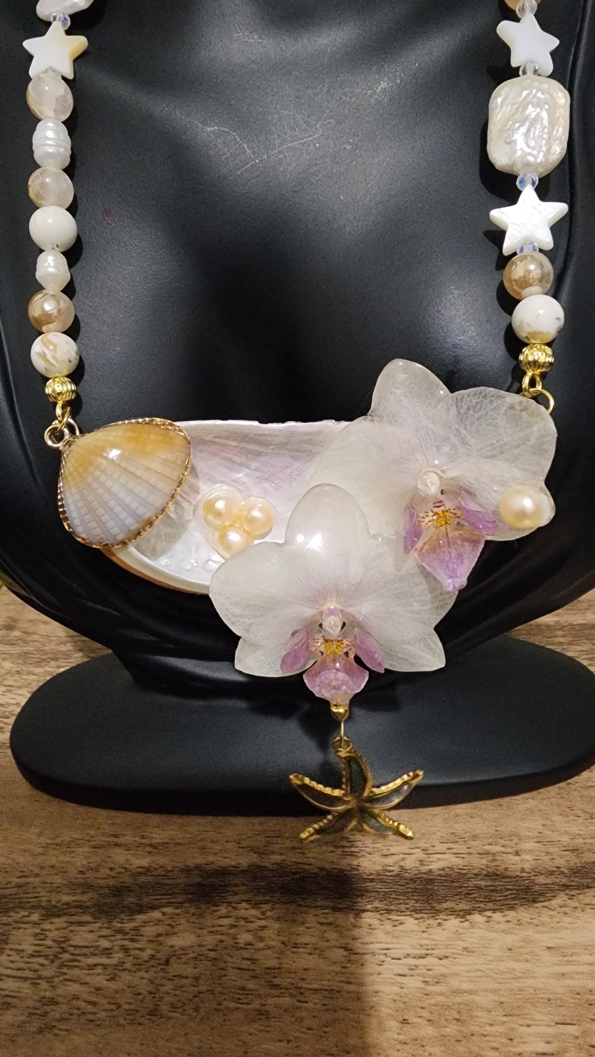 Orquidea natural encapsulada, concha de abulon, perlas de agua dulce, dije de estrella de mar, estrella y piedras de concha natural, piedras natural de ágata agrietada y cristales.